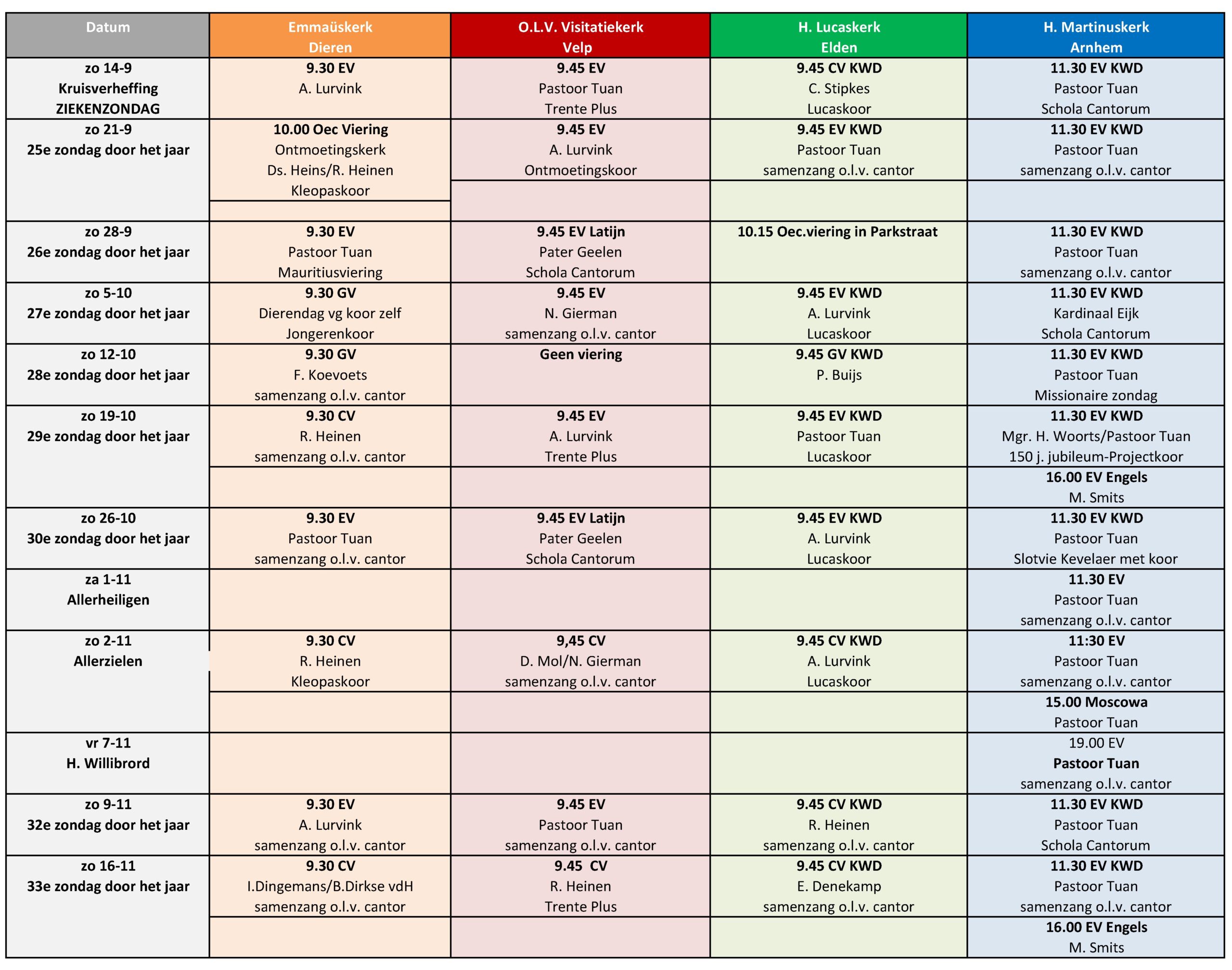 Afkortingen in het rooster van de vieringen: EV = EucharistieViering / CV = Woord- en CommunieViering / GV = GebedsViering / KWD = KinderWoordDienst