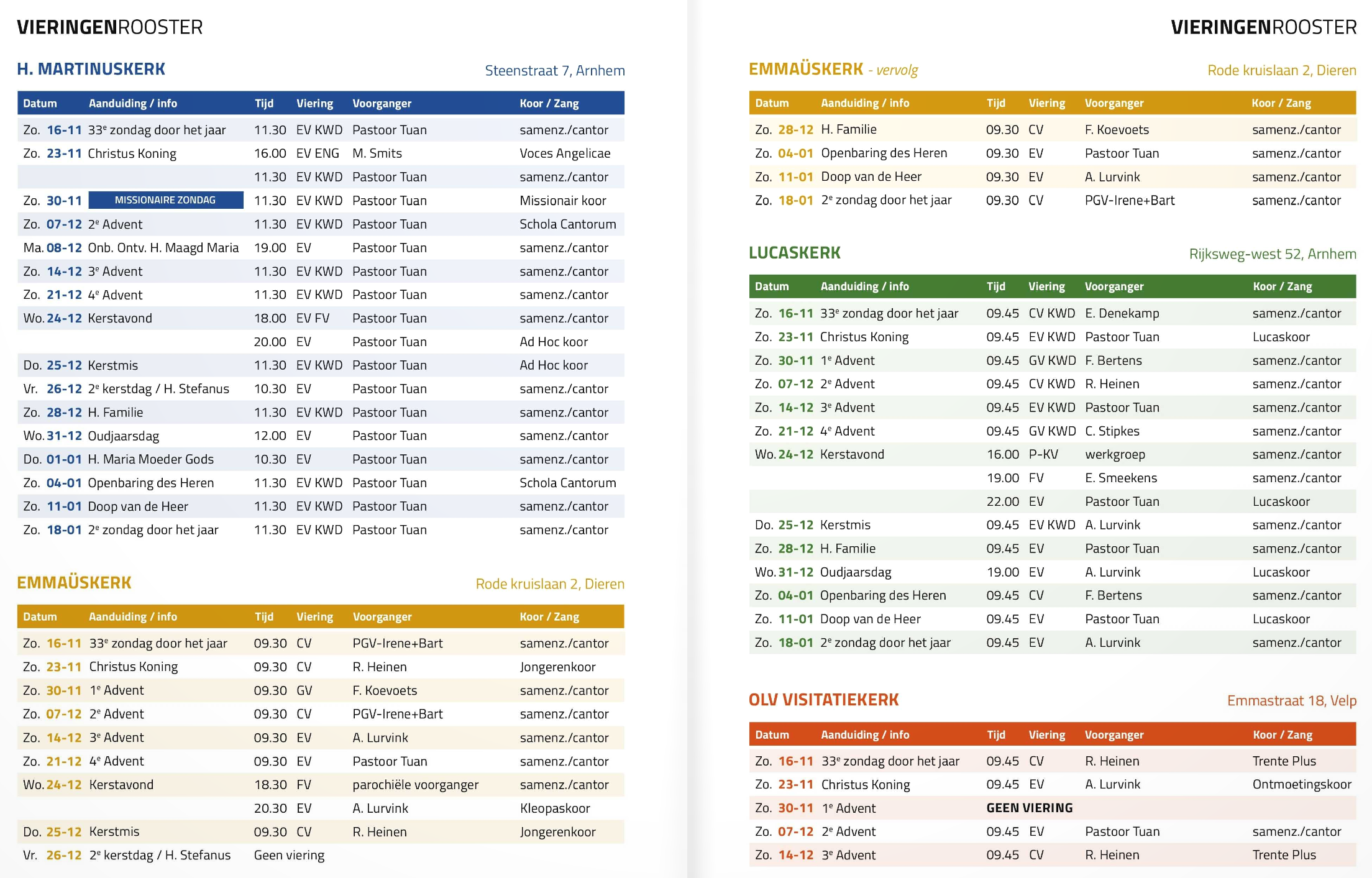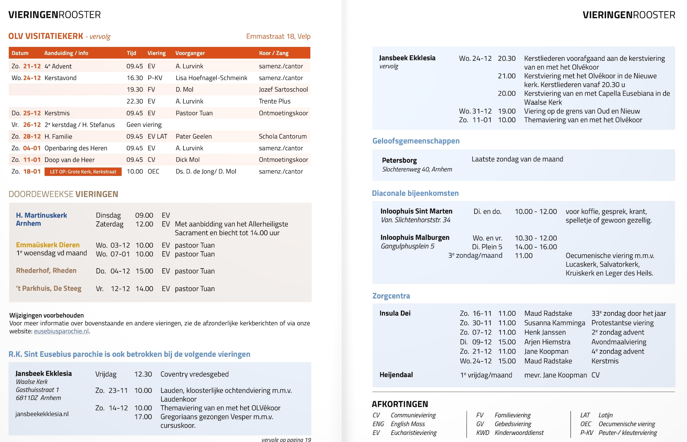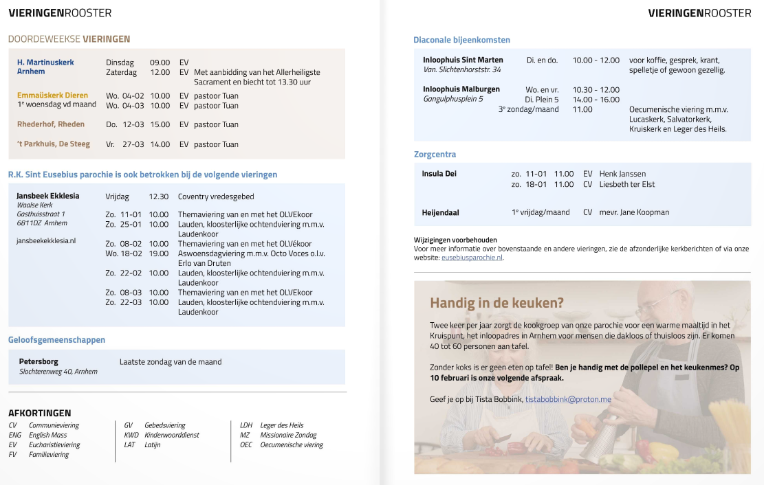 Afkortingen in het rooster van de vieringen: EV = EucharistieViering / CV = Woord- en CommunieViering / GV = GebedsViering / KWD = KinderWoordDienst